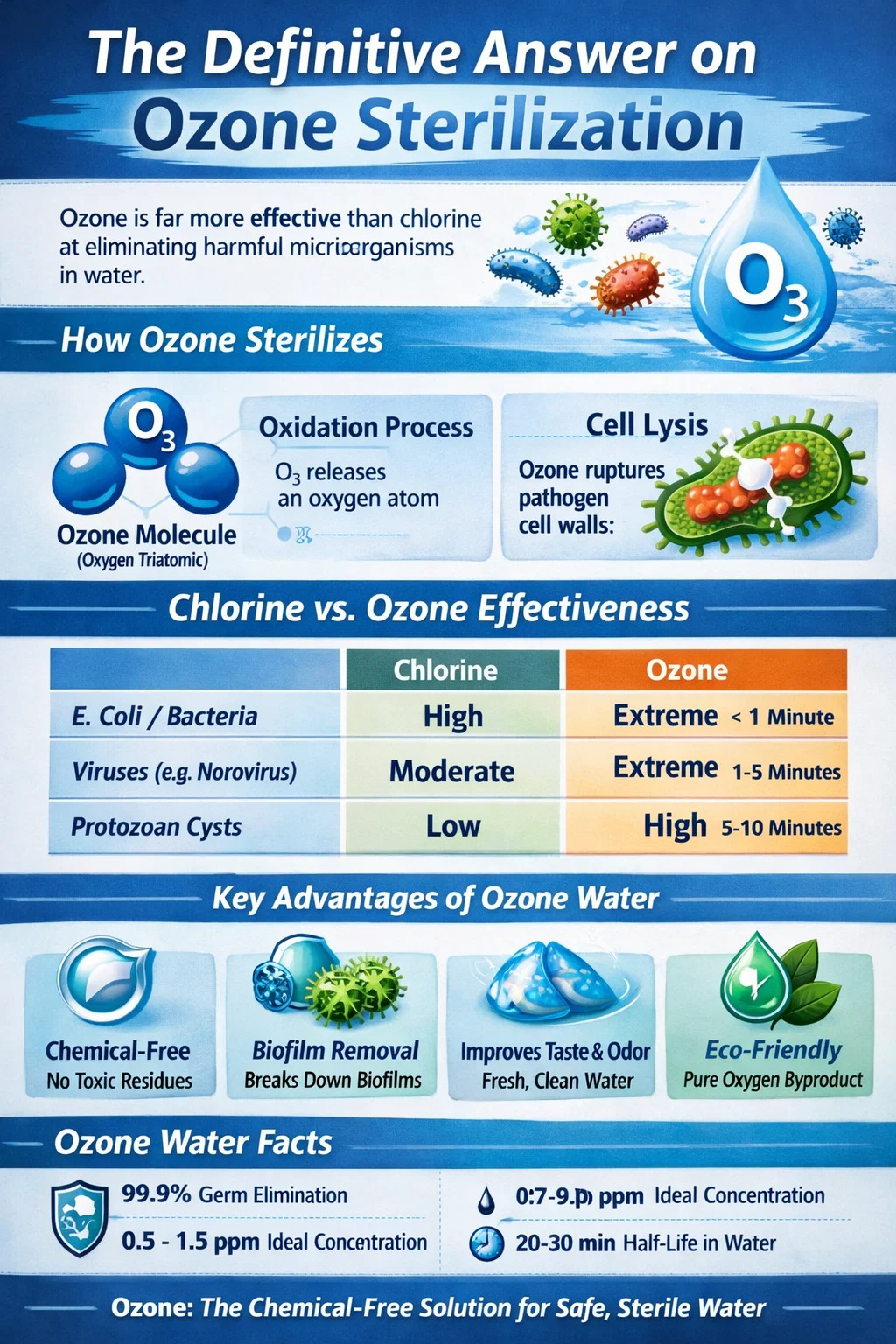 হ্যাঁ, ওজোন আজ উপলব্ধ জল জীবাণুমুক্ত করার সবচেয়ে শক্তিশালী এবং নির্ভরযোগ্য পদ্ধতিগুলির মধ্যে একটি। এটি জৈবিক হুমকির বিস্তৃত বর্ণালী দূর করতে ঐতিহ্যগত ক্লোরিনের চেয়ে অনেক বেশি কার্যকর। তরলে দ্রবীভূত হলে, ওজোন জল একটি উচ্চ-স্তরের জীবাণুনাশক হিসাবে কাজ করে যা একটি অর্জন করতে পারে ক্ষতিকারক অণুজীবের 99.9% হ্রাস ব্যাকটেরিয়া, ভাইরাস এবং প্রোটোজোয়া সহ, প্রায়ই যোগাযোগের কয়েক সেকেন্ডের মধ্যে।