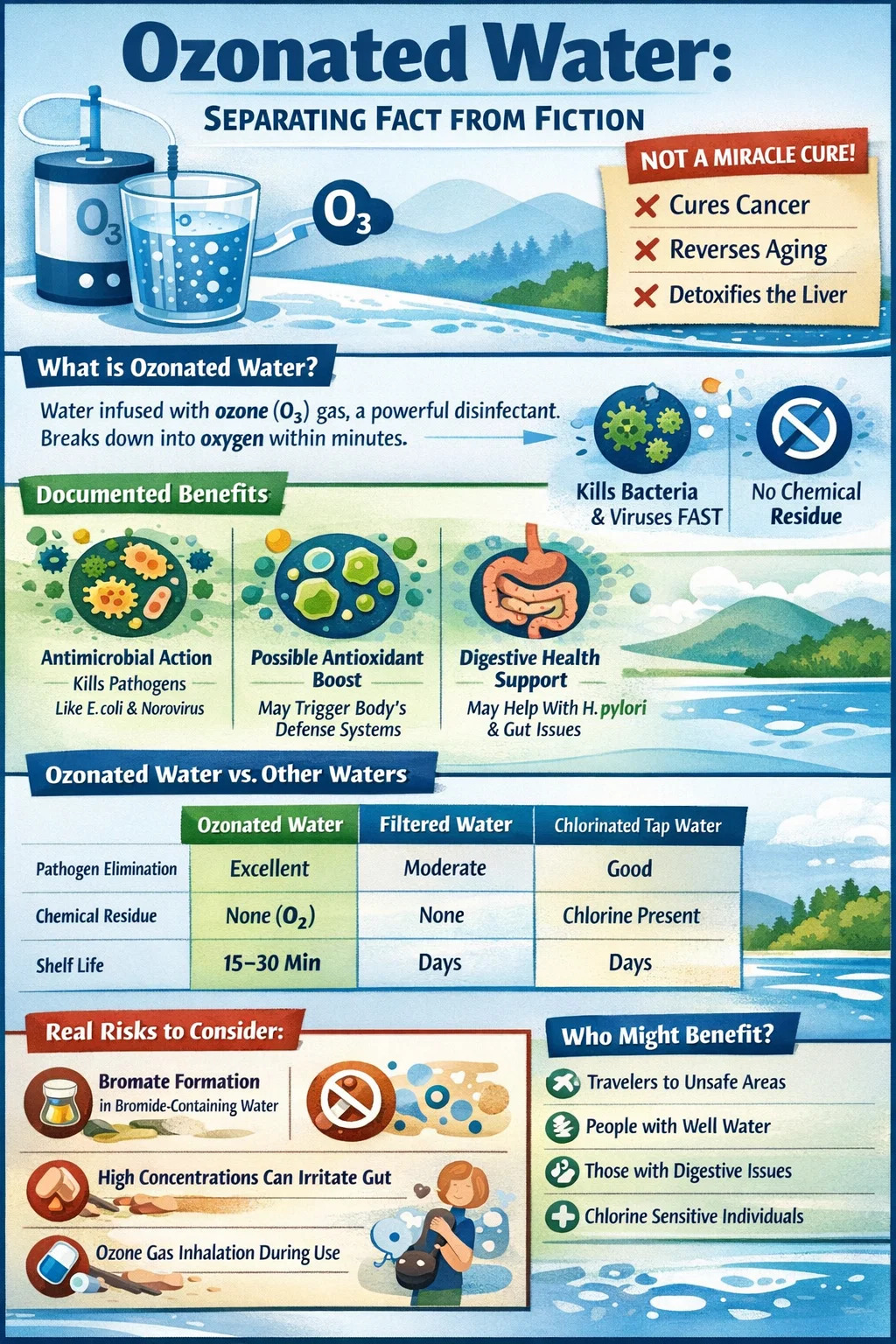 Ozonated water earns its place as a legitimate water treatment tool with real, documented benefits — primarily its exceptional ability to eliminate pathogens without leaving chemical residue. It also shows promising (though not yet definitive) evidence for supporting antioxidant defenses and oral health. Used at appropriate concentrations from a quality device and consumed fresh, it is safe for most healthy adults.