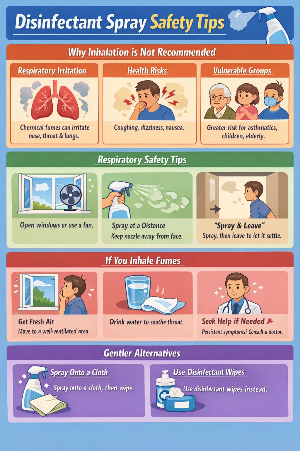 যদিও জীবাণুনাশক স্প্রে এটি বাড়িতে একটি সহায়ক পরিষ্কারের সাহায্য, সরাসরি এর ধোঁয়া বা স্প্রে কণা শ্বাস নেওয়া ভাল ধারণা নয়।