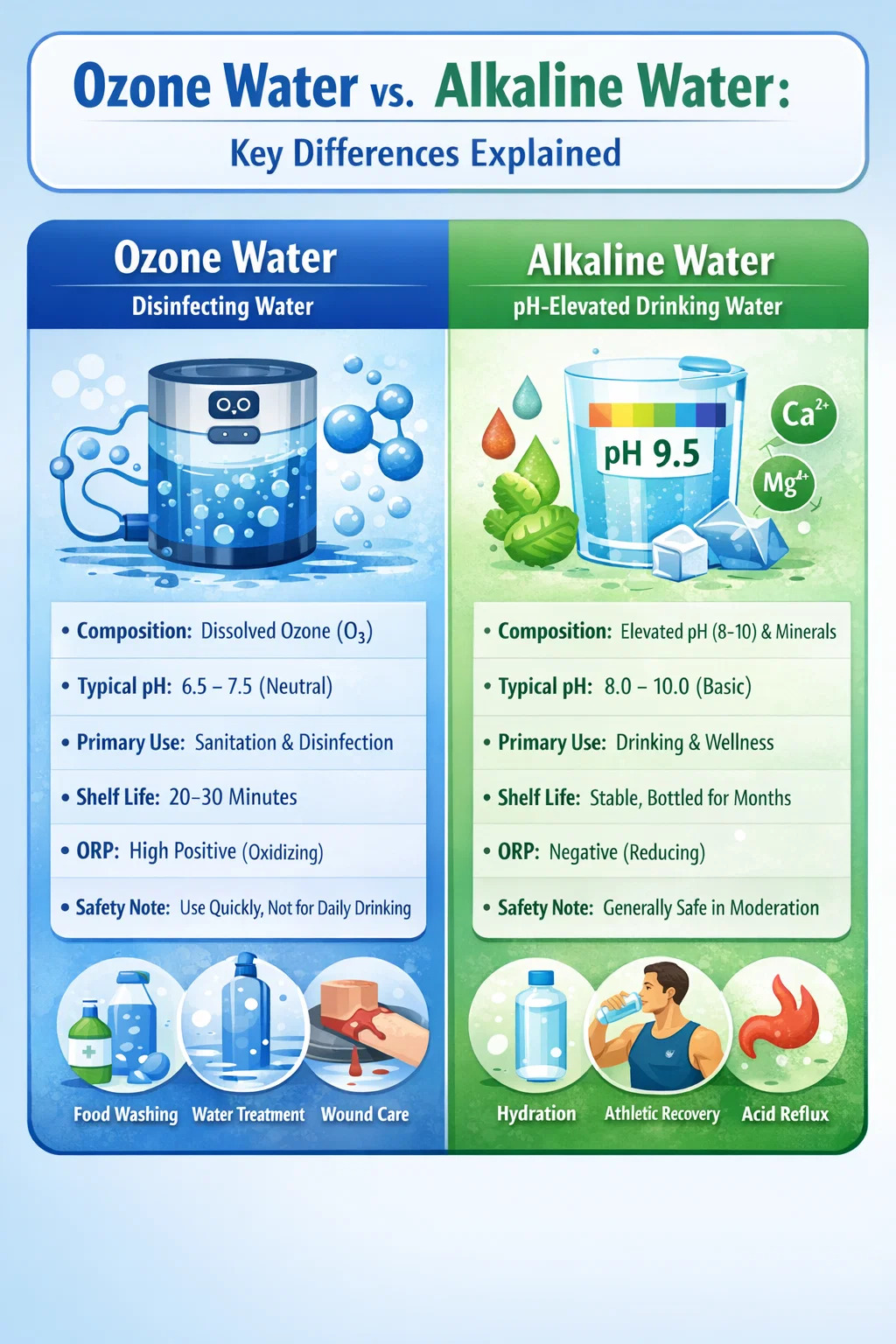 ওজোন জল এবং ক্ষারীয় জল বিভিন্ন রসায়ন, বিভিন্ন প্রয়োগ এবং বিভিন্ন প্রমাণের ভিত্তি সহ স্বতন্ত্র পণ্য। ওজোন জল হল একটি শক্তিশালী, স্বল্পস্থায়ী জীবাণুনাশক যা স্যানিটেশন কাজের জন্য সর্বোত্তম ব্যবহৃত হয় — খাবার ধোয়া, পৃষ্ঠের চিকিত্সা এবং জল পরিশোধন। ক্ষারীয় জল একটি পিএইচ-উন্নত পানীয় জলের পণ্য যা হাইড্রেশন এবং অ্যাসিড রিফ্লাক্স ব্যবস্থাপনার সাথে সম্পর্কিত বিনয়ী এবং এখনও বিতর্কিত সুবিধা রয়েছে।